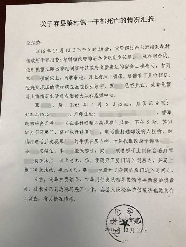 廣西一鎮(zhèn)干部被發(fā)現死在宿舍 頸部腹部有傷口